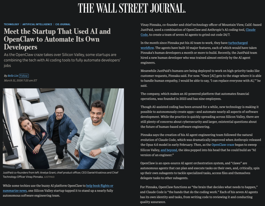 - Wall Street Journal: Startup Uses AI and OpenClaw to Automate Developers (Mar 2026)